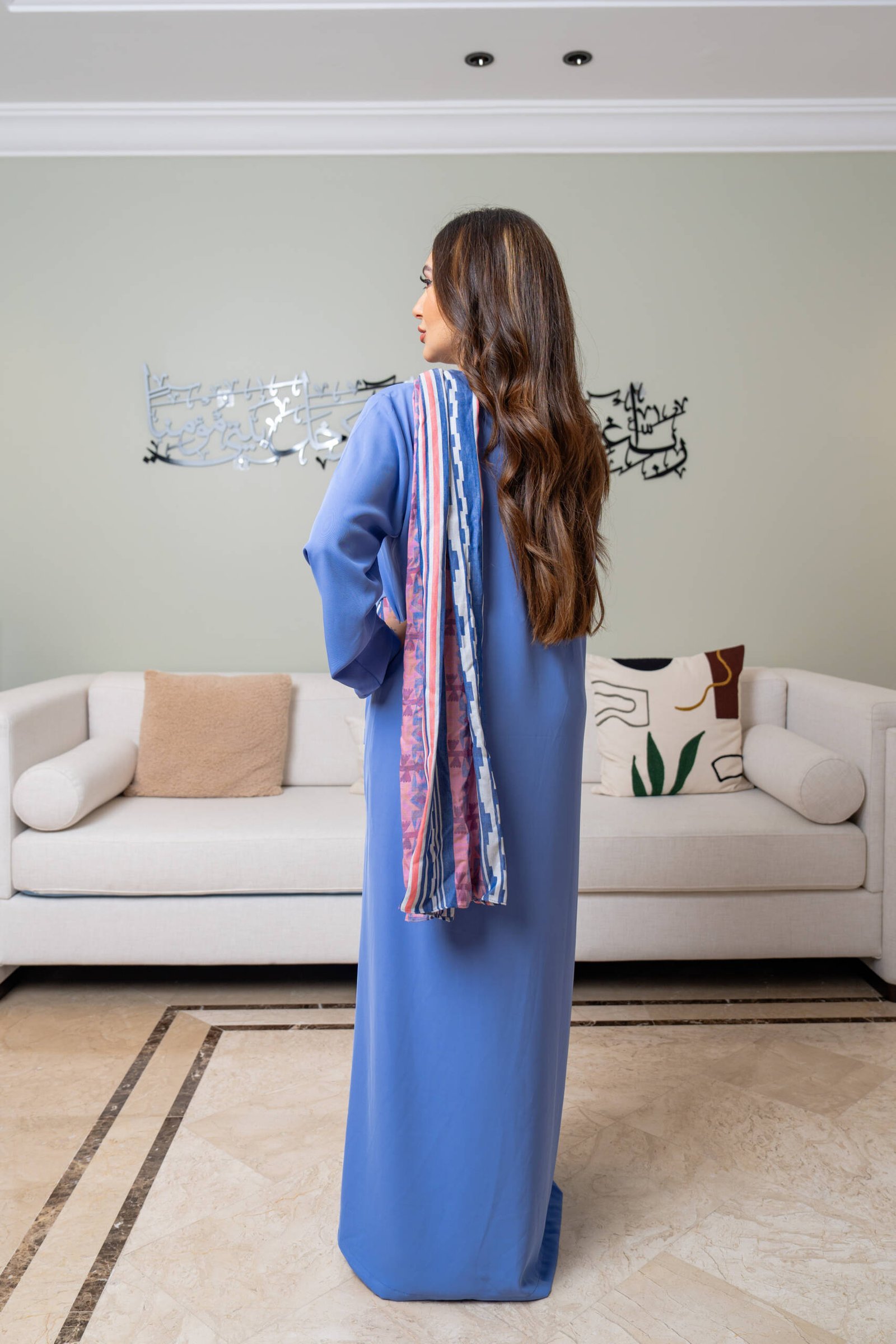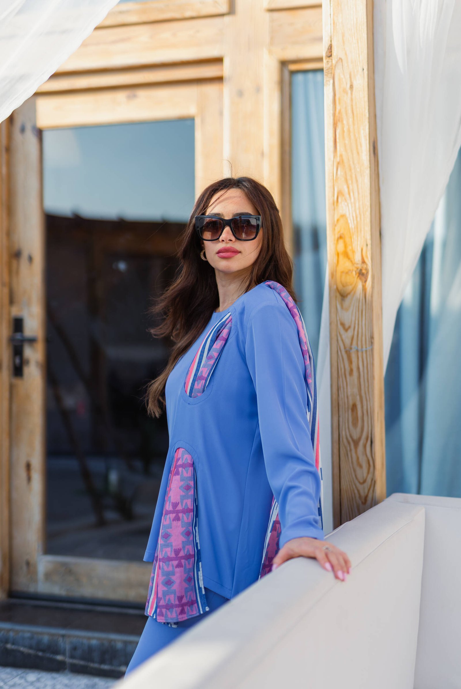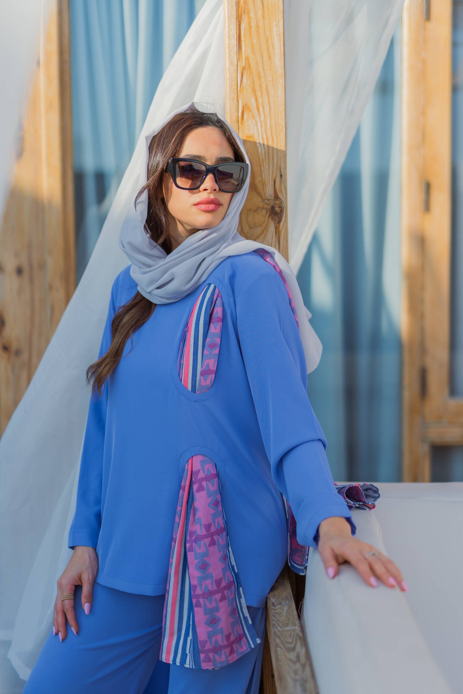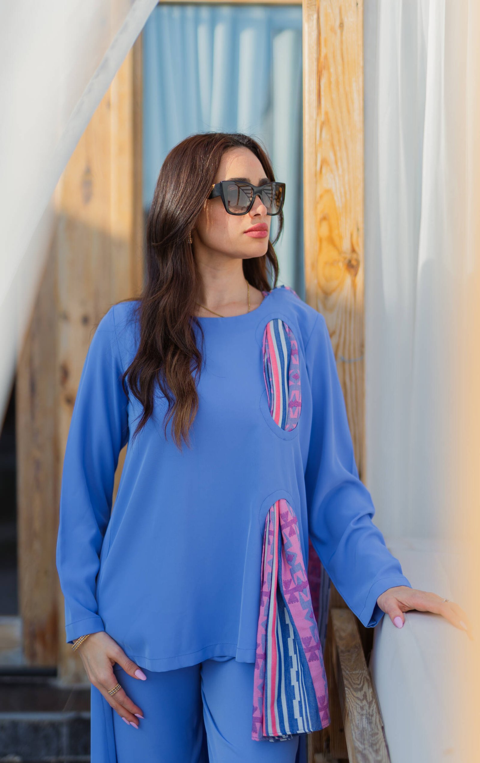 A relaxed, flowy blouse completed with a vibrant colorful scarf that adds a an artistic touch. Designed with lightweight fabric for comfort and elegance. Perfect for casual outings or stylish gatherings. Fabric: Crepe
